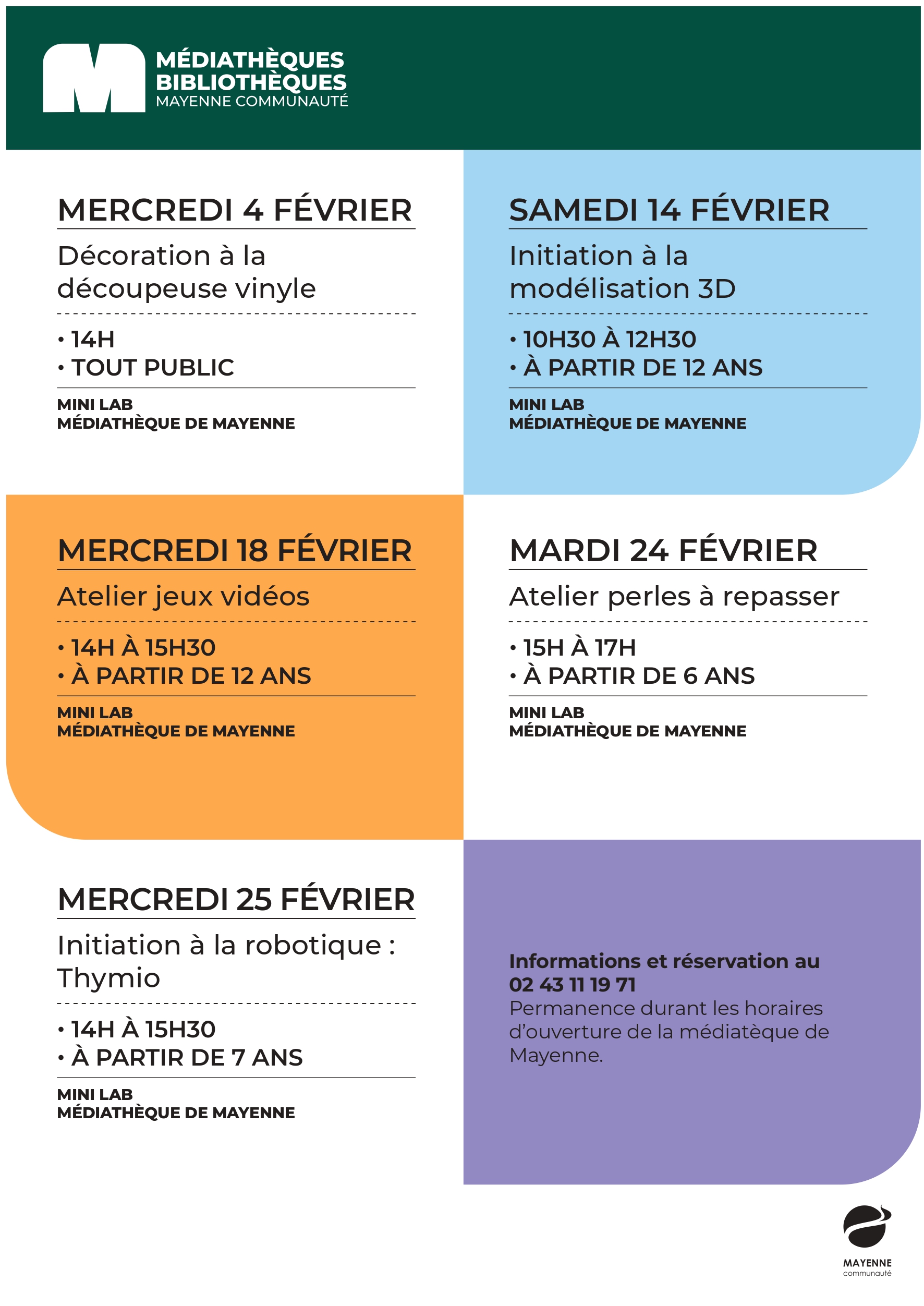 Les ateliers du Mini Lab Le Mini Lab de la médiathèque de Mayenne vous convie à des ateliers ludiques et créatifs, ouverts à tous, pour découvrir et expérimenter les machines numériques.